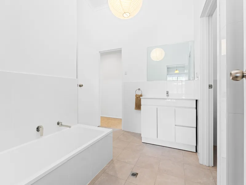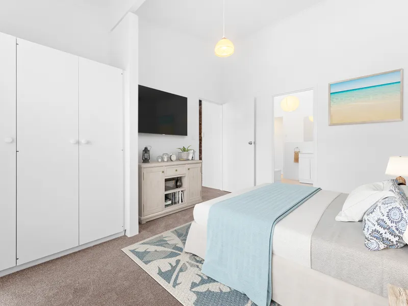Both bedrooms are generously sized, with the main bedroom including built-in cupboards and direct access to the renovated two-way bathroom. The second bedroom is positioned at the rear of the property and is ideal as a second bedroom, guest room, or home office.