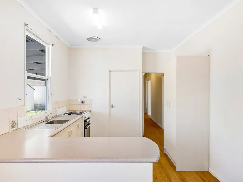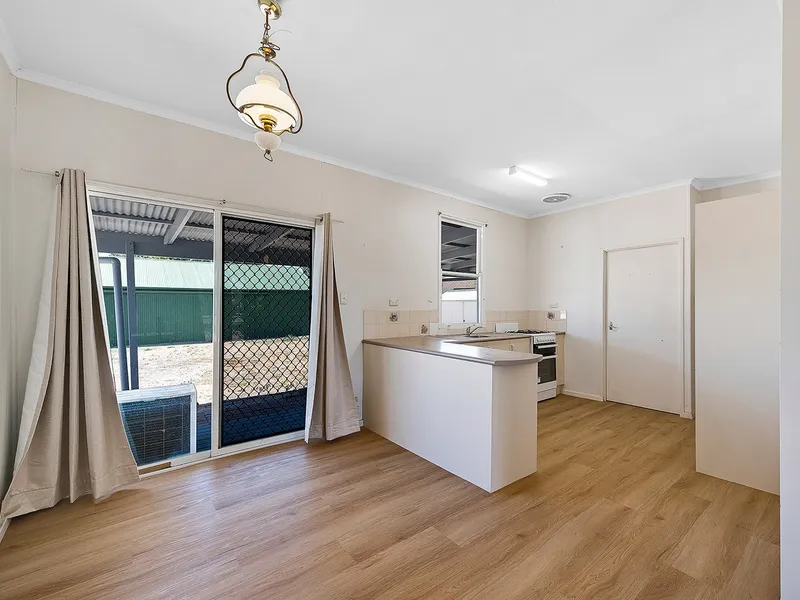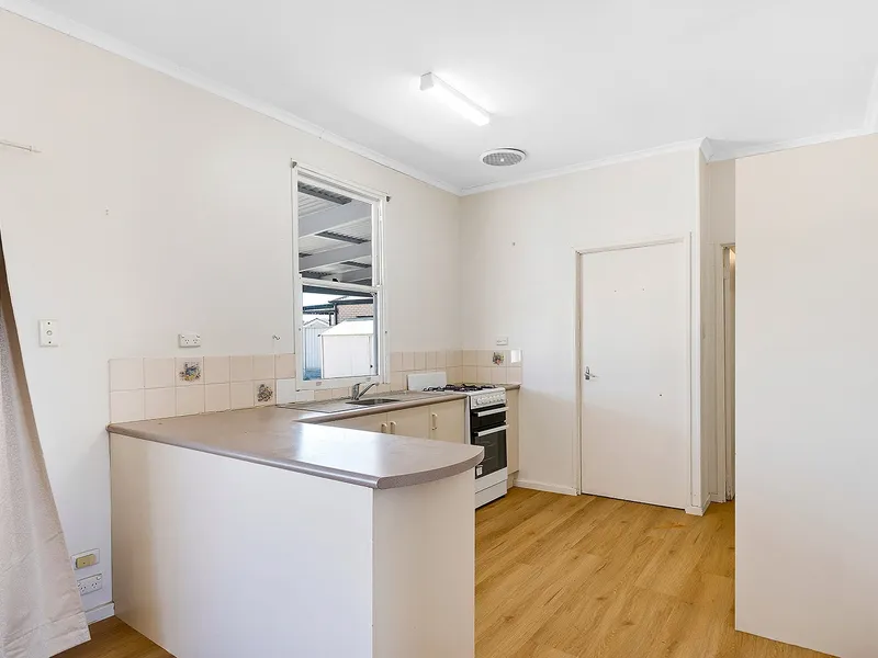The neat and tidy kitchen is equipped with gas cooking and ample storage, flowing through to a lovely lounge and dining area—perfect for relaxing or entertaining.