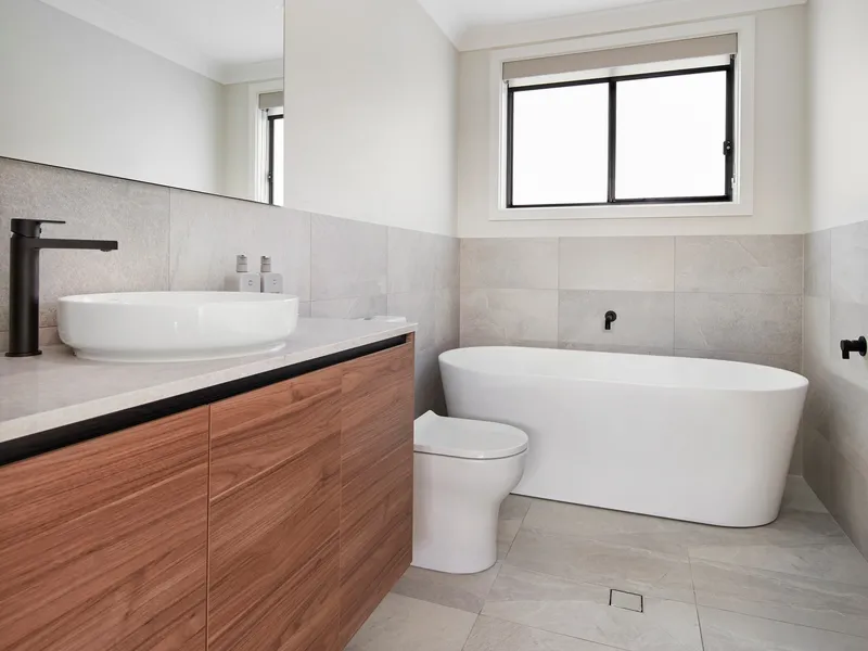 Elegant Bathrooms: Wall-hung stone-topped vanities, semi-frameless shower screens, a freestanding bathtub, and premium fixtures.