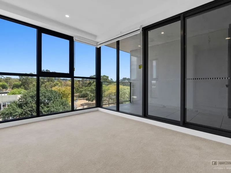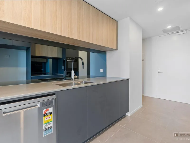 Bathed in natural light thanks to floor-to-ceiling glazing that opens seamlessly to the balcony, this apartment features an open-plan living, kitchen and dining zone that flows effortlessly outdoors. Ideal for evening drinks, weekend brunches or simply enjoying the treetop, uninterrupted views of the Lyneham Wetlands. The kitchen is contemporary and confident, featuring dark-toned stone benchtops, excellent storage and Fisher & Paykel appliances, including an induction cooktop, oven, rangehood and dishwasher. Neutral flooring and sleek cabinetry create a cohesive, stylish interior palette that feels both modern and inviting.