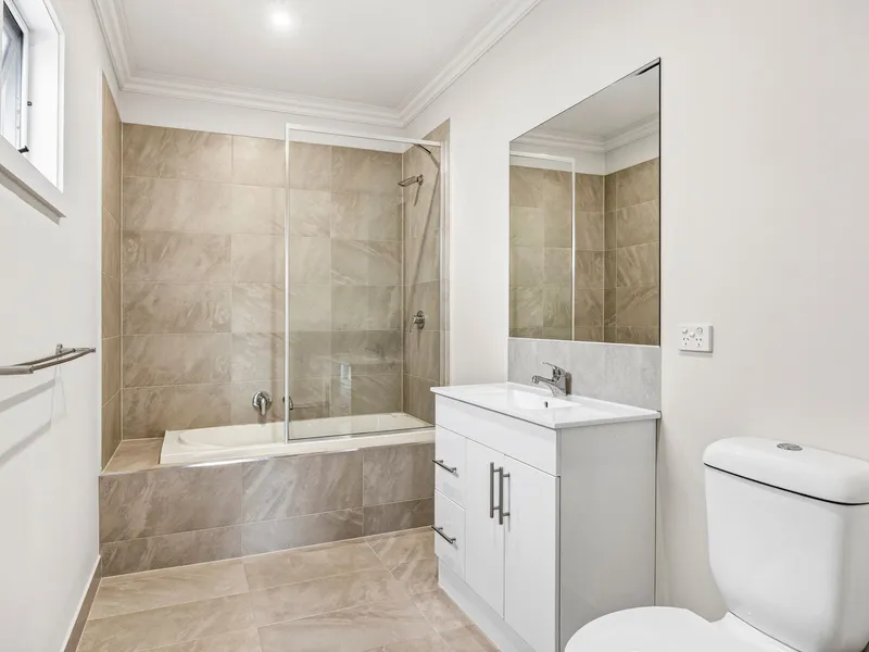 Upstairs, the light-filled primary suite features built-in robes and a private ensuite, while the second bedroom is equally well-proportioned with built-in robes. A central bathroom with shower, bath, vanity and toilet services the upper level with ease.