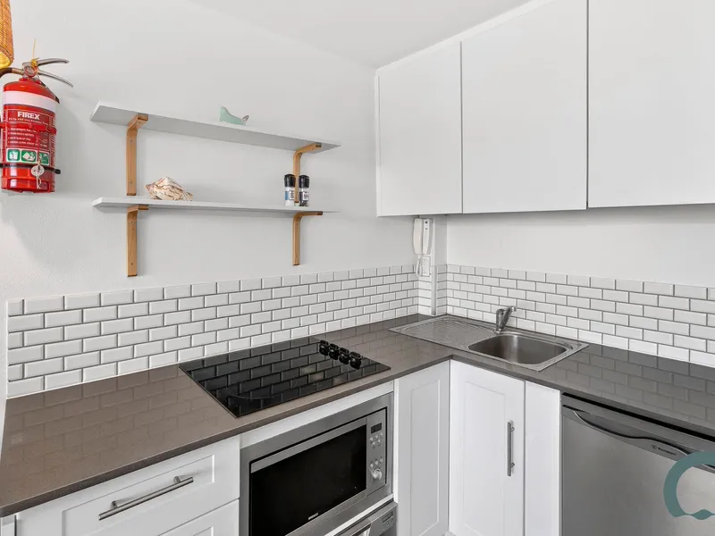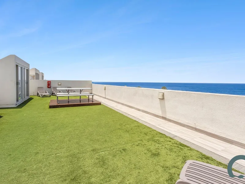 The open-plan living and dining area flows to a sun-drenched east-facing balcony, perfectly framing sweeping views across the surf to Shelley Beach and St Patrick’s Seminary. A sleek stone kitchen with electric cooktop and dish drawer, spacious bedroom with built-in wardrobes, and a well-presented bathroom complete this stylish coastal retreat.