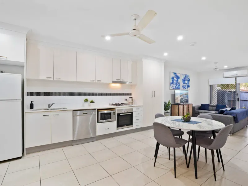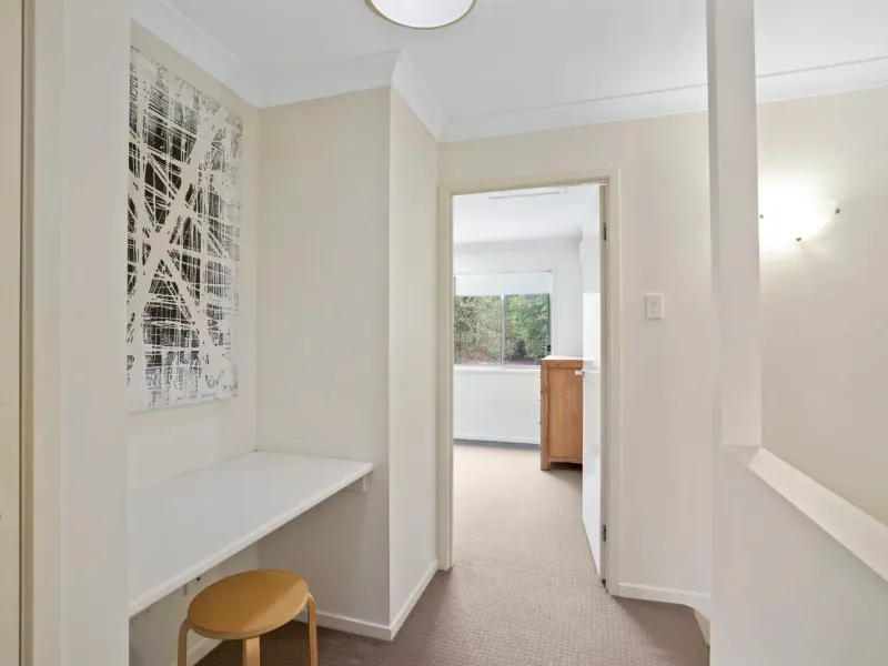 Low-maintenance in every aspect, the interiors are thoughtfully appointed for comfort and functionality. An air-conditioned living and dining area creates flows to a stonetop kitchen equipped with stainless steel appliances, and outdoors, a rear deck overlooks the secure yard, forming an ideal setting for weekend entertaining, children’s play and quiet moments in the coastal air. A second living area upstairs provides valuable separation, perfect as a kids’ retreat, media zone or study space.