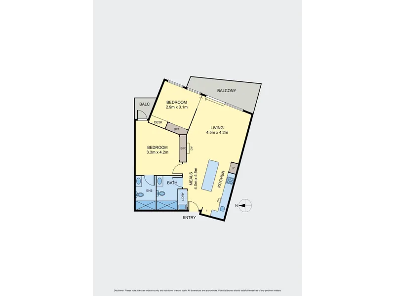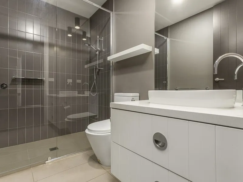 The well designed kitchen anchors the space with a stylish two tone finish, complemented by a movable stone island bench, quality Smeg gas cooking, under bench oven and dishwasher. Both bedrooms are thoughtfully positioned and include built in robes, with the main bedroom further enhanced by its own ensuite, study nook and balcony access. A central bathroom, European laundry and split system heating and cooling provide everyday comfort and functionality, while secure intercom entry, lift access and a dedicated car space and storage cage.