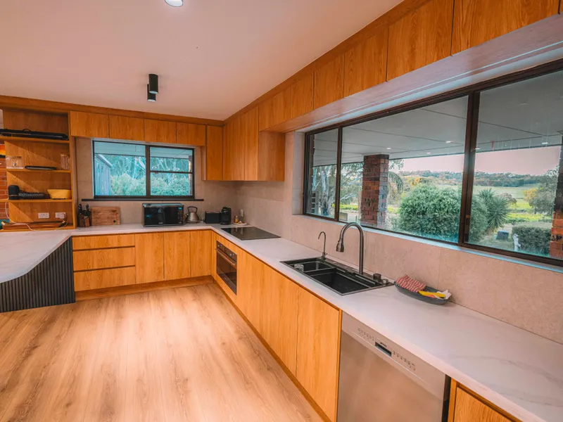 •Open-plan living, dining, and kitchen showcasing modern finishes, north-facing windows, and uninterrupted vineyard views
