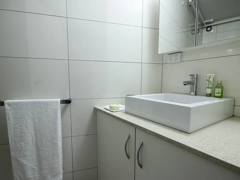 - Bathroom with shower over bath, ample vanity and mirror-cupboard storage
