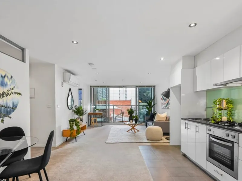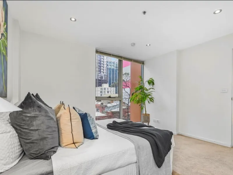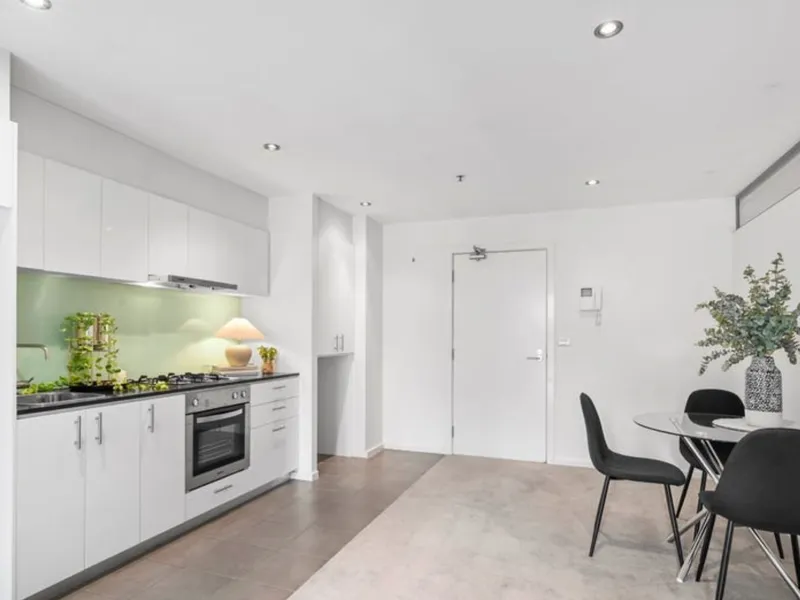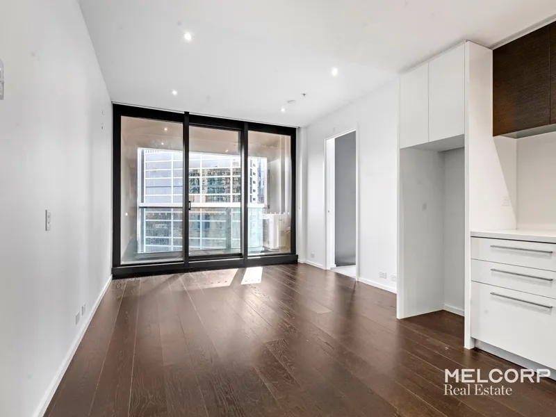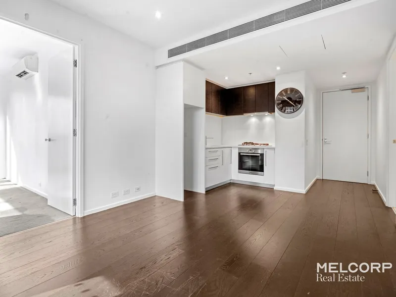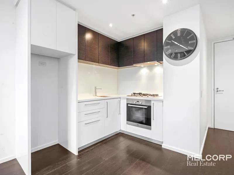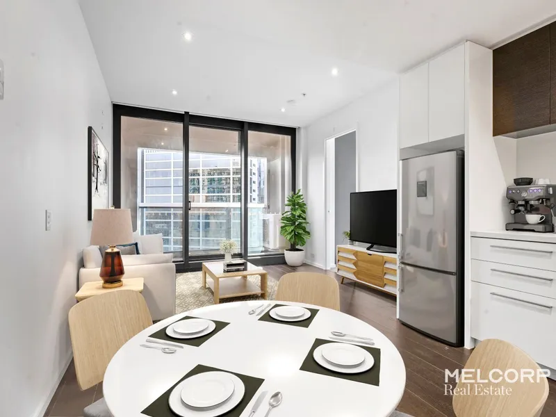 Situated on the 18th floor of Vision Apartments, this smartly designed two-bedroom, two-bathroom residence offers elevated living in the heart of Melbourne. The living area, framed by floor-to-ceiling windows, is flooded with natural light and opens onto a private balcony with cityscape views.