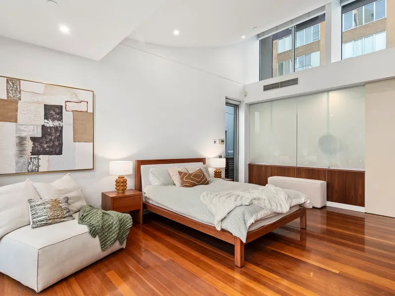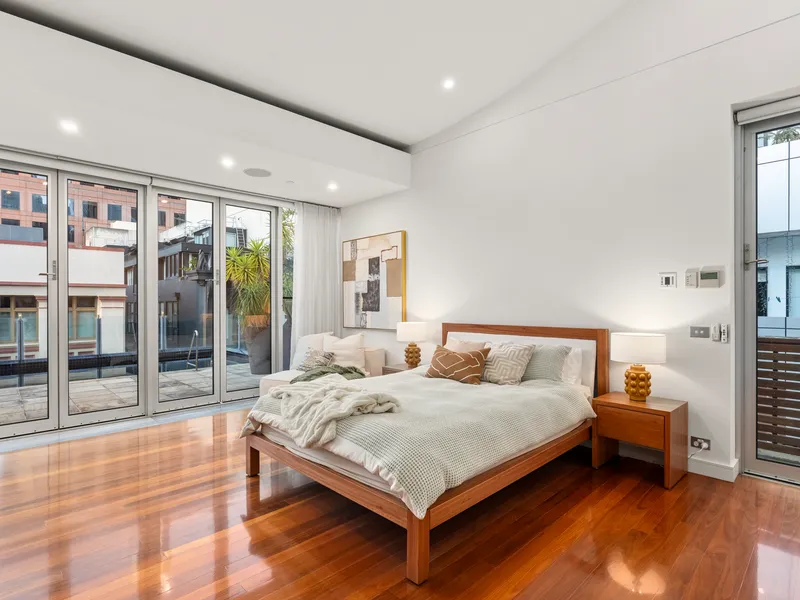 Upon entry, a grand spiral staircase with centrepiece pendant sets the tone for what’s to come. The first floor hosts a serene and spacious master suite complete with extensive robes, a lavish ensuite featuring a spa bath, and a private balcony retreat overlooking quiet Bligh Place.