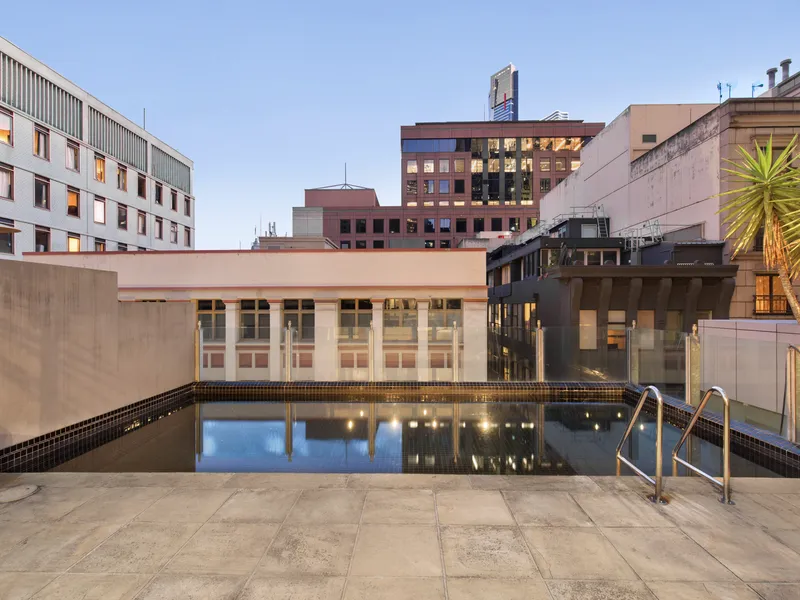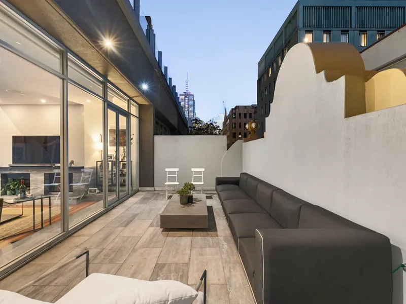Crowning the residence is an impressive terrace featuring a radiant 7-metre pool (approx.) and expansive deck, offering all-day sun and breath-taking views across Melbourne’s heritage skyline.