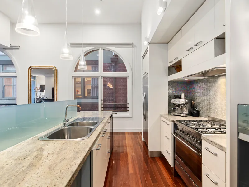 The main living and entertaining area captures natural light through expansive glazing, opening to a generous southern terrace framed by the building’s timeless façade. Also showcased is a gourmet kitchen appointed with stainless steel, stone, and mosaic finishes, Miele and Smeg appliances, gas cooking, an integrated refrigerator, and ample storage. Thoughtfully designed bi-fold doors ensure superb acoustic privacy while creating a seamless indoor–outdoor connection.