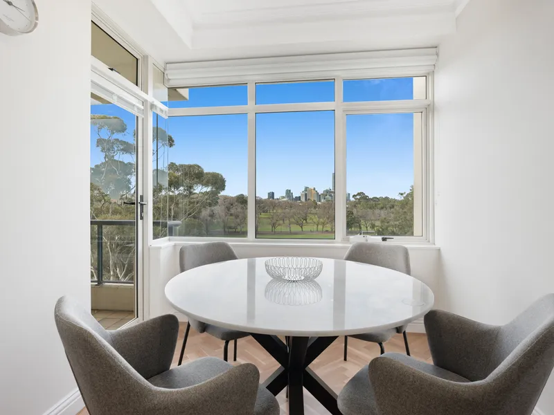 Bathed in natural light this lovely garden apartment comprises:- entrance hall with parquetry flooring and storage leading you through to an expansive open plan living and dining area which flows onto a large covered terrace overlooking Fawkner Park. The gourmet kitchen features stainless steel appliances, dishwasher, generous bench space and mulitple storage options, additional sunny meals area also overlooking the park.