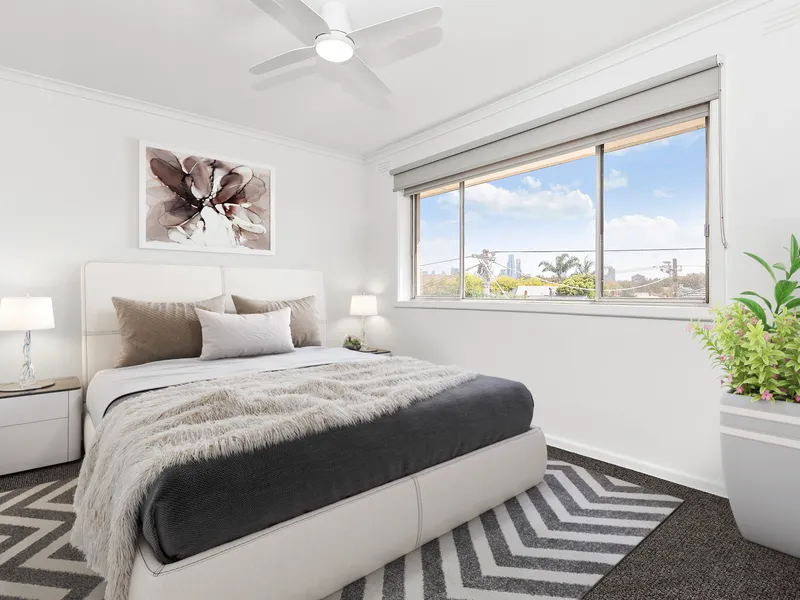 Filled with natural light from its coveted northern orientation, this pristine two-bedroom apartment sits on the second/top floor of a secure building. The home blends bayside tranquility with city convenience, offering a thoughtfully designed layout, quality finishes, and stunning city skyline views from both the open-plan living area and master bedroom.