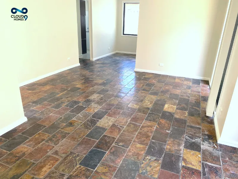 Tile flooring in the living area and slate tiles in the bedrooms