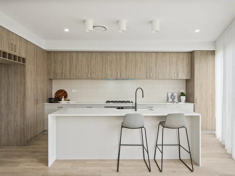 - Contemporary open-plan kitchen with feature island, stone benchtops, gas cooktop, premium appliances and ample storage