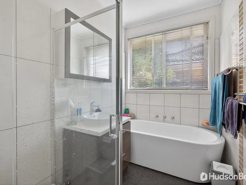 The home comprises three generously sized bedrooms, all complete with built-in robes. A large central bathroom includes a separate bath, shower, and toilet, ideal for family functionality.