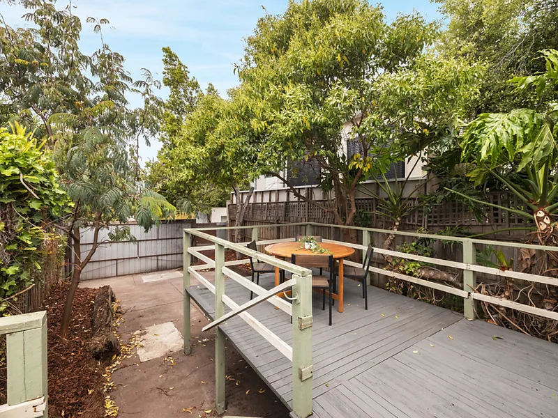 A spacious living/dining room filled with natural light leading through to the updated kitchen/meals area with breakfast bar and stainless-steel electric cooker. Other features include high ornate ceilings, original hallway fretwork, split system heating and air conditioning, plus a sunny backyard with entertaining deck and secure off-street parking space (via ROW).