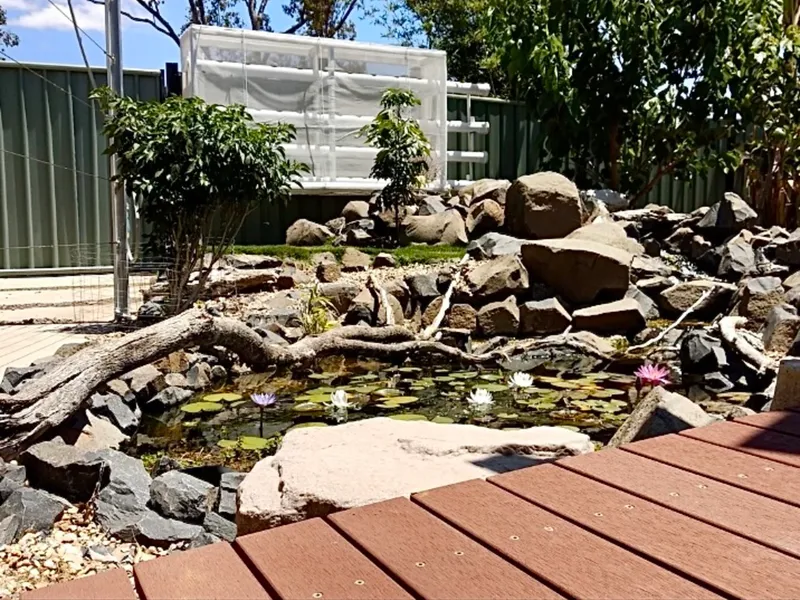Step into a sanctuary like no other. Imagine strolling through lush greenery, harvesting fresh produce from your expansive edible garden, pausing by a tranquil pond, or unwinding to the gentle trickle of your own private mini waterfall. For the hobbyist or tradesperson, the enormous 4-bay powered Colourbond shed with seamless flooring is the ultimate workspace or storage haven.