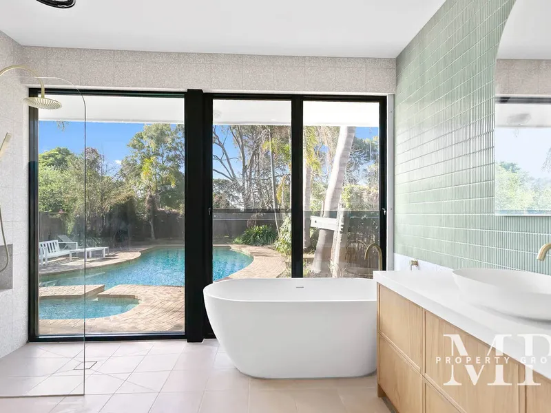 The master suite is a private retreat, complete with a walk-in robe and a beautifully appointed ensuite featuring a freestanding bath and walk-in shower. Additional bedrooms are generously proportioned and serviced by two further designer bathrooms, offering comfort and privacy for family and guests alike.