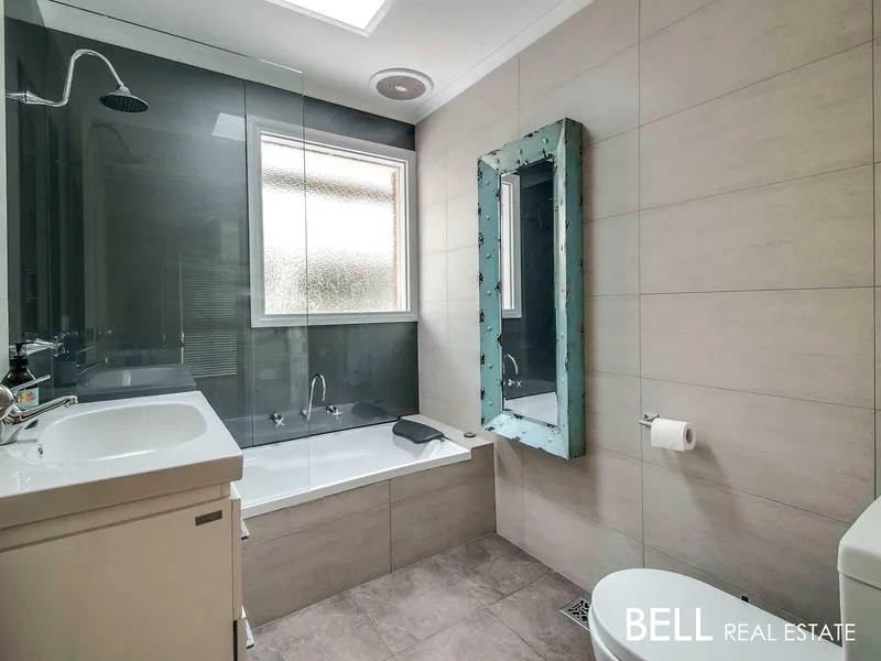The master bedroom includes an ensuite, built in robe and ceiling fan. The further two bedrooms also with robes, with a central updated bathroom including a bath.