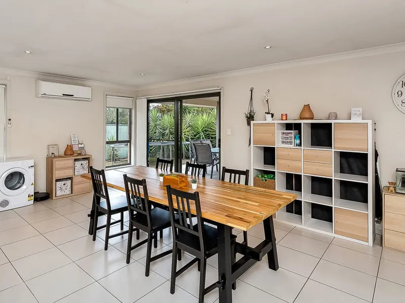Inside, the home features four well-sized bedrooms, including a main bedroom complete with a walk-in robe and private ensuite. A central bathroom with a bathtub and toilet serves the remaining bedrooms. The open and light-filled living areas create a welcoming space. The kitchen is equipped with a stove, oven, dishwasher, and pantry, offering practical storage and functionality for everyday living. Carpeted bedrooms provide added comfort, while air conditioning ensures year-round climate control. A dedicated laundry room further enhances the home's practicality.