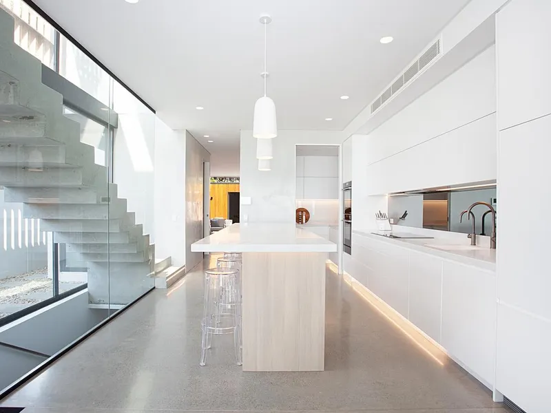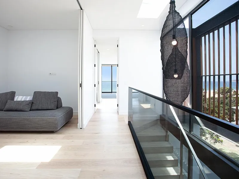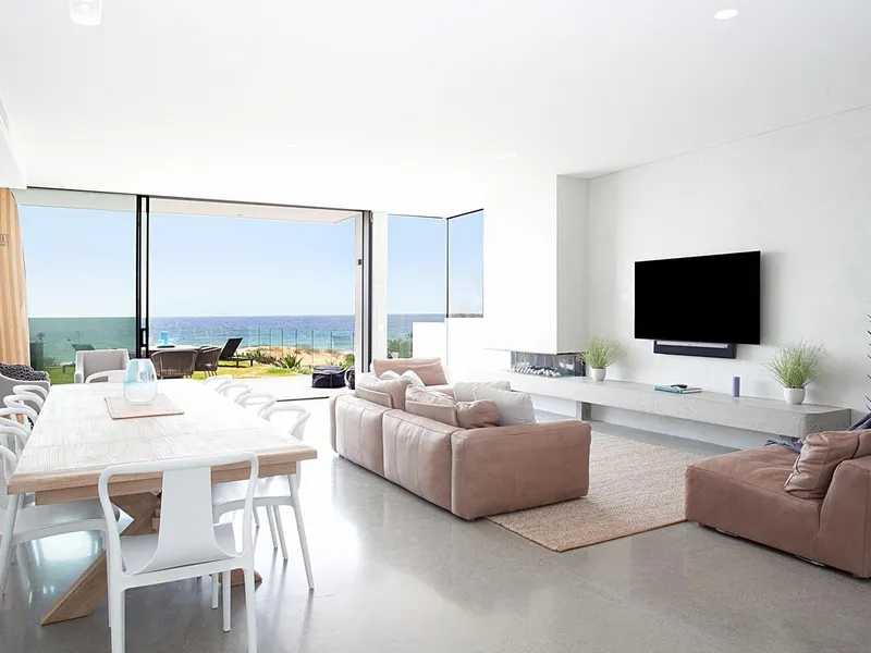 Designed to maximise natural light and seamless indoor–outdoor living, the home showcases a spectacular open-plan living and dining zone flowing effortlessly to the oceanfront entertaining terrace and landscaped lawn. Floor-to-ceiling glass frames the incredible beach outlook, while refined finishes including polished concrete flooring, a designer kitchen and sophisticated bathrooms elevate the home's modern aesthetic.