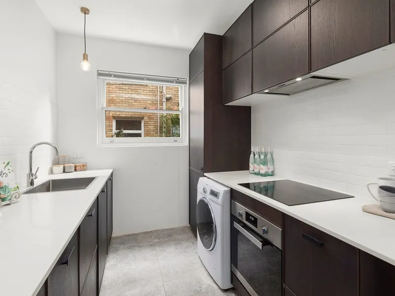 - Stylish galley kitchen with stone benchtops and integrated appliances