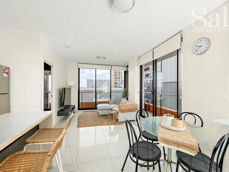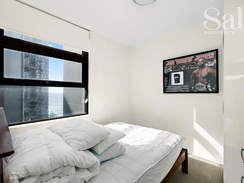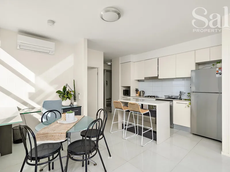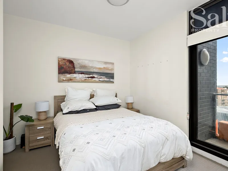 Bathed in natural light thanks to its prized north-easterly aspect, this fifth-floor two-bedroom apartment in the Arvia complex delivers an easy, connected seaside-city lifestyle.