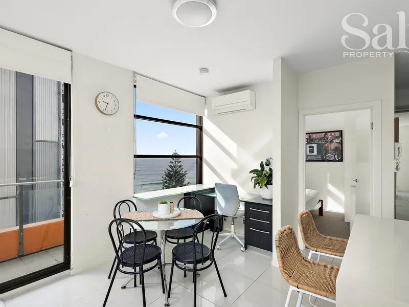 The layout keeps things simple and functional, with a bright open plan living zone, stone-topped kitchen and handy study nook. Floor-to-ceiling glass sliders pull the space outdoors to an alfresco balcony, where northerly views stretch across the city, capture a slice of the harbour, and a glimpse of the ocean at Newcastle Beach offering a perfect spot to check the surf conditions without leaving home.