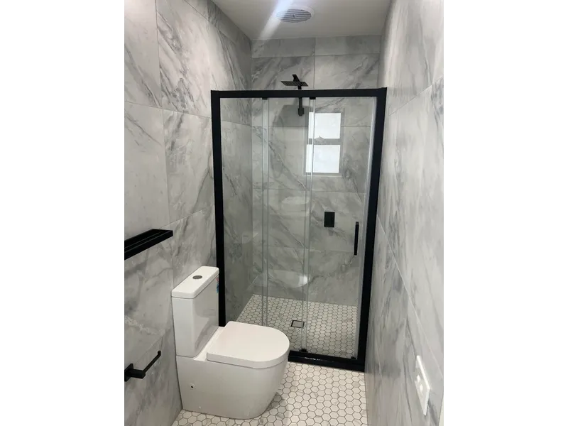 Modern bathrooms with floor-to-wall marble tiles & honeycomb floor tiles, matte black finishes with rainfall shower heads.