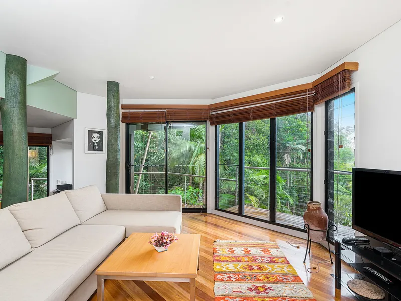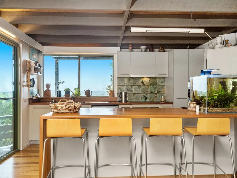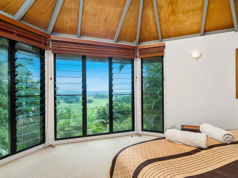 Stunning, fully furnished, 3 story home plus separate wing. The property is set on 20 acres of farmland and regenerated rainforest with an abundance of wildlife.. The home is character filled, architect designed, and is nestled in hills of Newrybar with ocean views from all the wrap around decks.