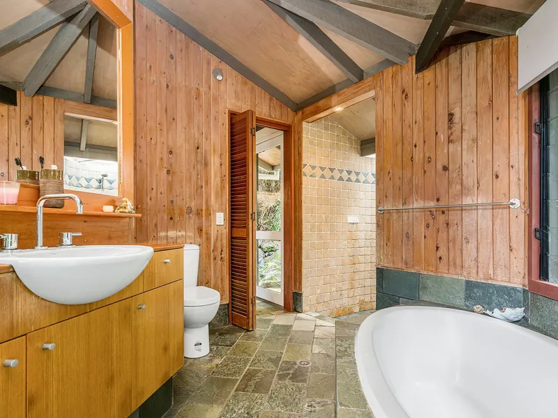 Wood fire in the open plan living and dining areas which flow out onto the timber deck overlooking the swimming pool. Electric cooking facilities in the main house. Beautiful, tumbled marble shower with skylight and a separate bathroom overlooking the back deck.
