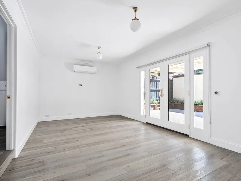 *Light-filled front dining room adjoining a well-appointed kitchen featuring cooktop, oven, dishwasher, breakfast bench, and generous under-bench storage.