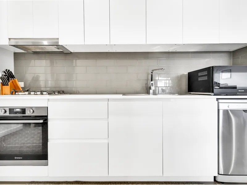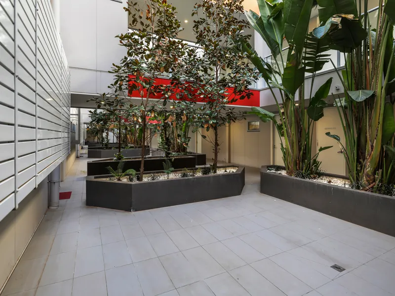 Filled with natural light, the spacious open-plan living and dining area opens onto a private tiled balcony with a leafy outlook, perfect for relaxing or enjoying your morning coffee. The modern kitchen features stone benchtops, stainless steel appliances and a dishwasher.