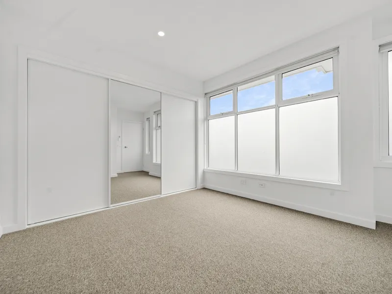 Featuring two spacious bedrooms and two well-appointed bathrooms, the home provides plenty of space for relaxation and privacy. Both bedrooms include built-in robes and soft carpeting, creating a comfortable and functional retreat. The open-plan living and dining area is enhanced by beautiful wooden floorboards throughout the lounge room and large French windows that fill the space with plenty of natural light, creating a warm and inviting atmosphere.
