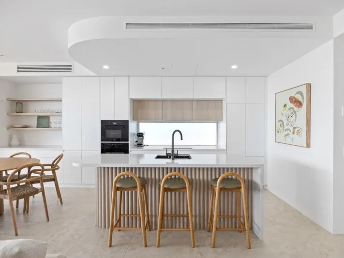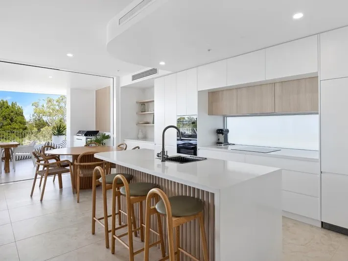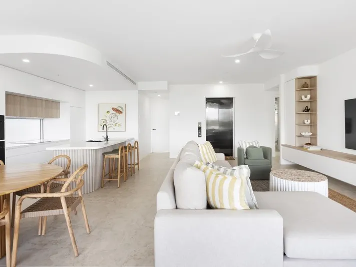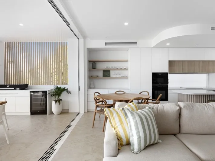 Designed to embrace light, space and seamless indoor-outdoor living, the apartment unfolds through an expansive open plan layout where the living, dining and kitchen zones connect effortlessly to a huge sunlit balcony. This is a home that is made for long lunches, slow mornings and evenings spent entertaining, with a built-in barbeque and generous proportions that invite year-round enjoyment. Whether hosting friends, enjoying a quiet afternoon with a book, or simply taking in the ambient coastal air, the balcony becomes a true extension of the living space.