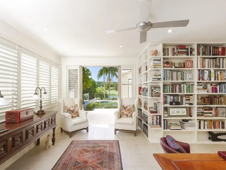 Notice how bright north-easterly natural light streams into the generous sunken main living room with custom-designed sandstone wall and integrated television and fireplace. The living and the adjoining dining room both have immediate connectivity to Mediterranean-inspired expansive undercover terraces, thanks to doors which seemingly disappear. With its idyllic aspect and uninterrupted water and golf course views including the par 3, 13th green, entertaining on the terrace is a breeze from long lunches to sundowners watching the local fauna and birdlife on the course or admiring the flowering frangipanis in the rear garden.