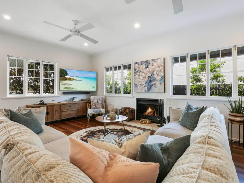 Downstairs, the original section of the home retains its classic Queenslander charm, with multi-paned windows, VJ walls and elevated ceilings reflecting its heritage roots. Living and dining spaces are distinct and well-defined, offering a more traditional layout that provides separation, privacy and flexibility. Satinay timber floors and a contemporary kitchen support everyday living, while a decorative fireplace adds visual warmth and character to the main living area.
