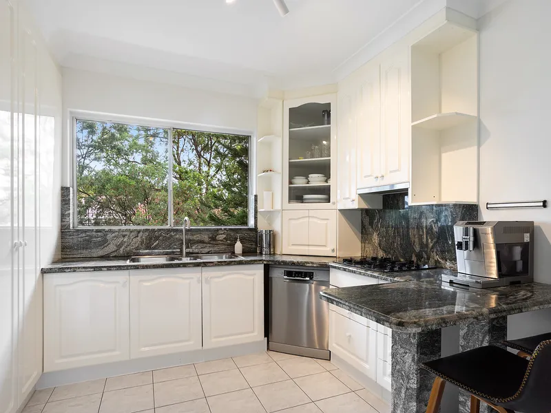 - Prestige kitchen with stone benchtops, integrated fridge and dishwasher and gas cooking