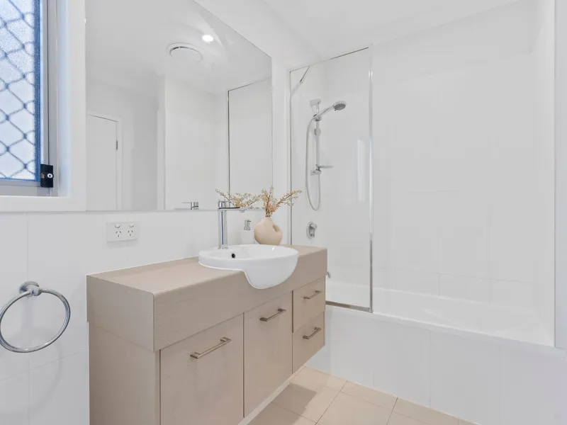 Upstairs, high ceilings create a sense of space throughout the private accommodation level. Three generously sized bedrooms, all complete with built-in robes and soft carpeting, provide comfortable retreats. The master bedroom features its own private ensuite, while the main bathroom includes a shower over a full-sized bathtub, ideal for families or guests.