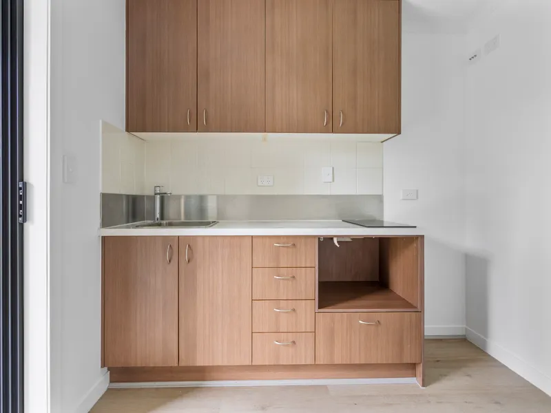 Featuring high ceilings and a functional open-plan layout, the home flows seamlessly to a private elevated deck. Designed for comfortable everyday living, the apartment combines generous proportions with practical features throughout.