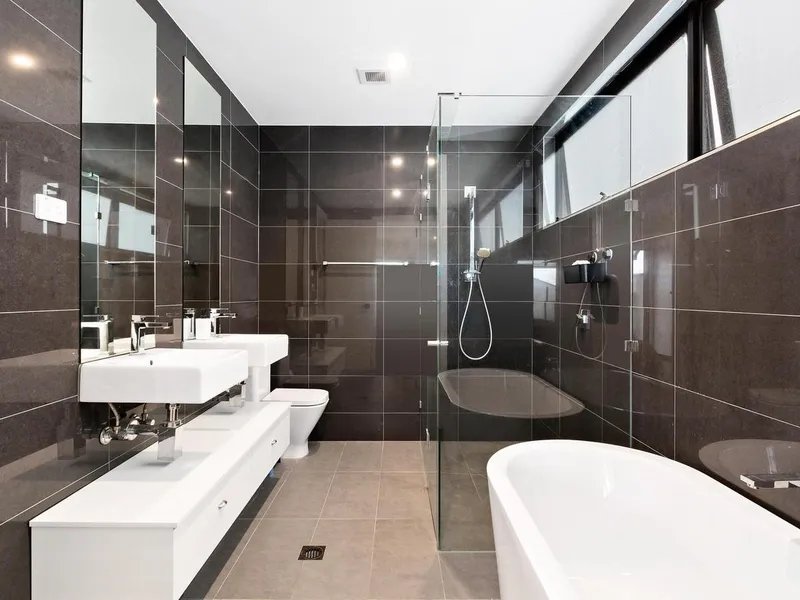All bedrooms feature built-in wardrobes and split-system heating and cooling, ensuring year-round comfort. The expansive master suite occupies the top floor and includes a private balcony and a luxurious ensuite with a bathtub and double vanity.