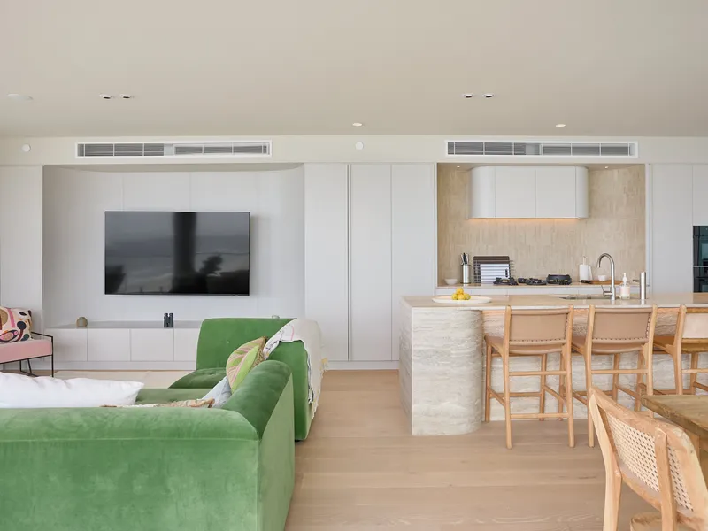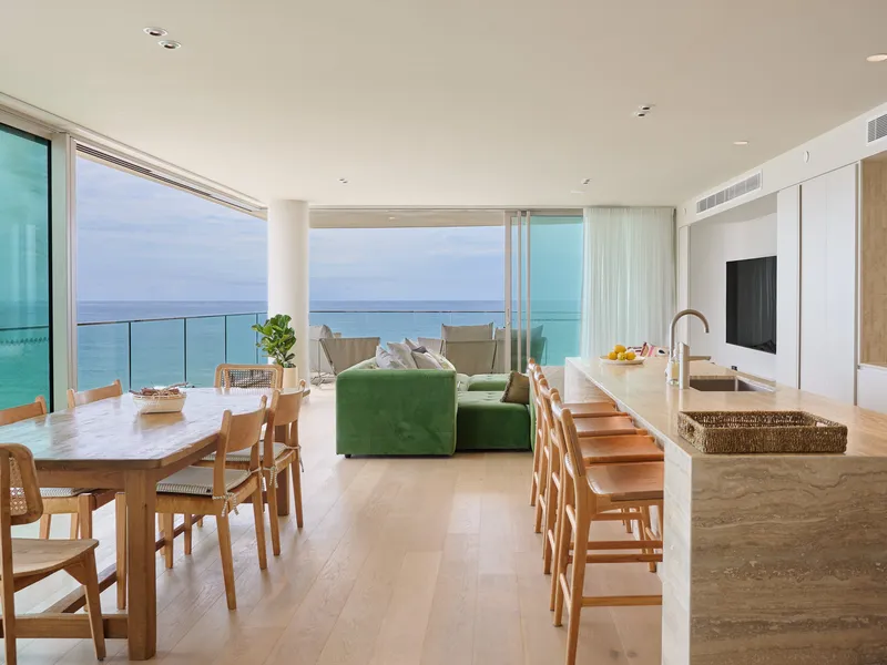 Spanning approximately 200sqm on the south-eastern side of Level 7, the apartment boasts breathtaking, uninterrupted ocean views and abundant natural light streaming through expansive floor-to-ceiling glass. The refined coastal design features an open-plan living space where the kitchen and dining areas seamlessly flow onto a vast oceanfront balcony. This outdoor haven is complete with an integrated gas BBQ, perfect for alfresco dining, relaxation, and entertaining.