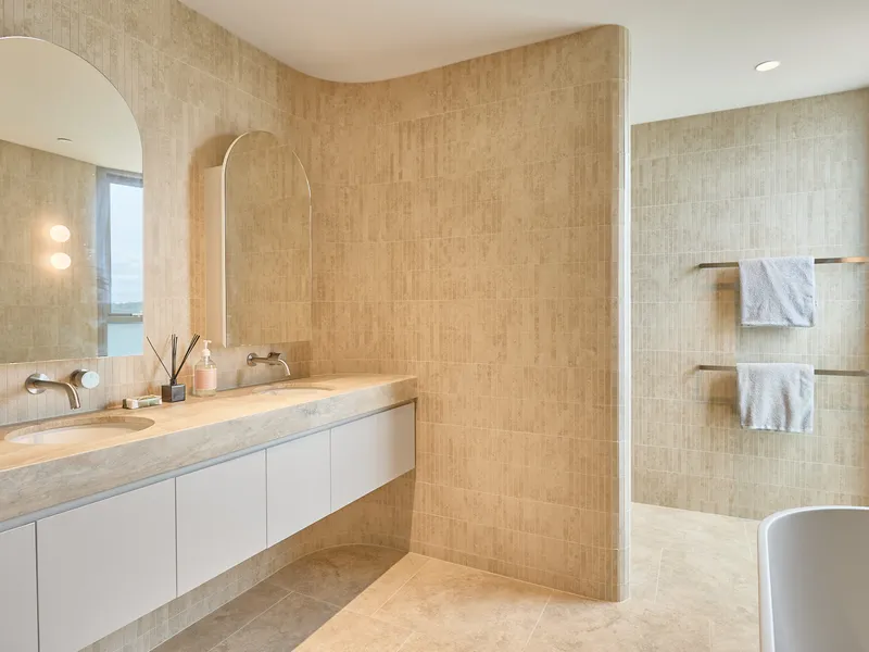 The sophisticated interiors showcase European Oak flooring and a soft, neutral palette. The statement kitchen is equipped with natural stone benchtops and splashback, four Pitt burners, a large island with seating, integrated Miele appliances, premium brushed-nickel tapware, an integrated Zip water purifier, and a Vintec wine fridge.