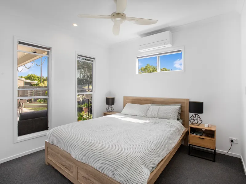 Central to the home is the tiled open-plan living and dining area, complete with air-conditioning and ceiling fans for year-round comfort, while large sliding doors seamlessly connect indoor living to the covered outdoor entertaining area.