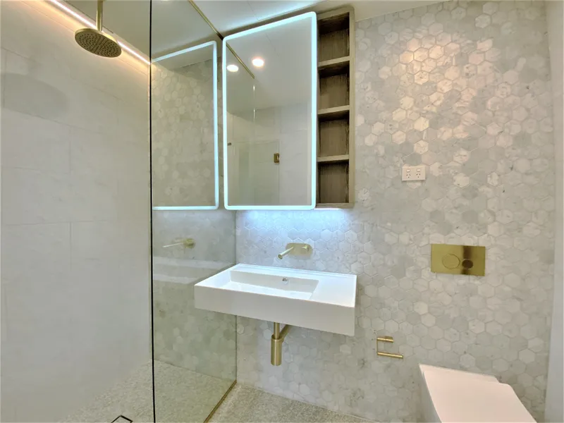 • Designer stone bathroom, fully tiled walls & flooring