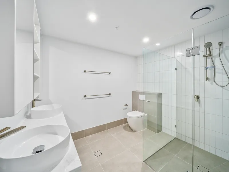 Situated on level 1, the apartment features an open-plan living and dining area with seamless access to a private balcony, perfect for entertaining. The expansive kitchen includes an island bench, premium induction cooktop, SMEG dishwasher, electric oven, and ample pantry space to meet all your culinary needs.