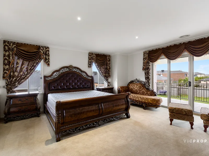 *Upstairs grand master bedroom with a modern ensuite, a spacious walk-through robe, and balcony access