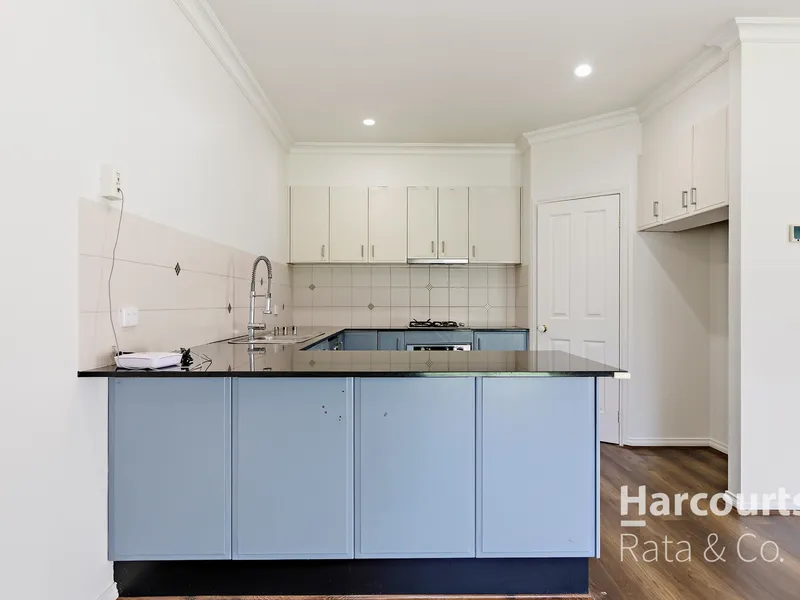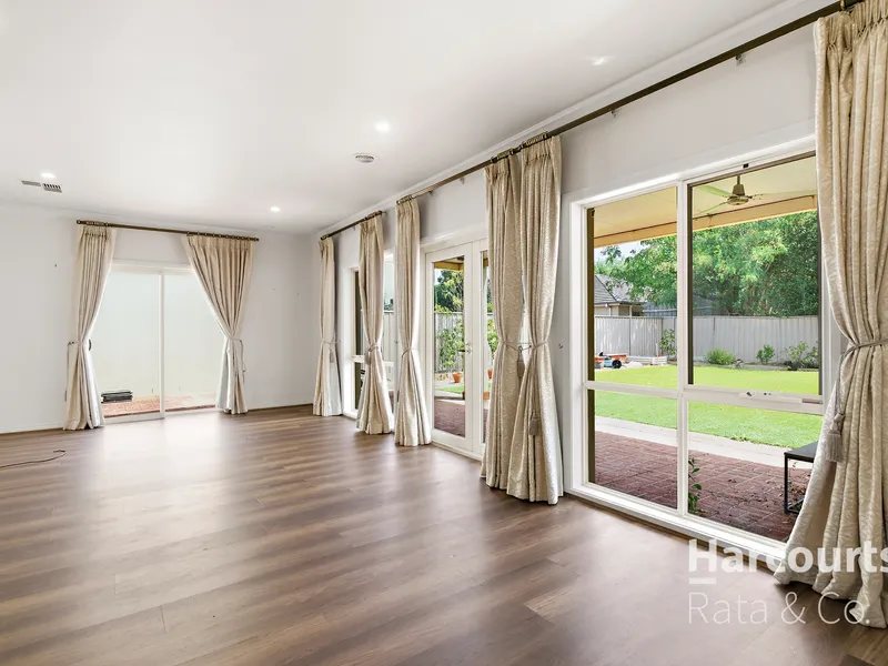 The home’s open-plan living area is perfect for family gatherings and includes split system air conditioning for year-round comfort. The modern kitchen boasts stainless steel appliances, including a dishwasher, and an island bench top, seamlessly connecting to the meals and family area.