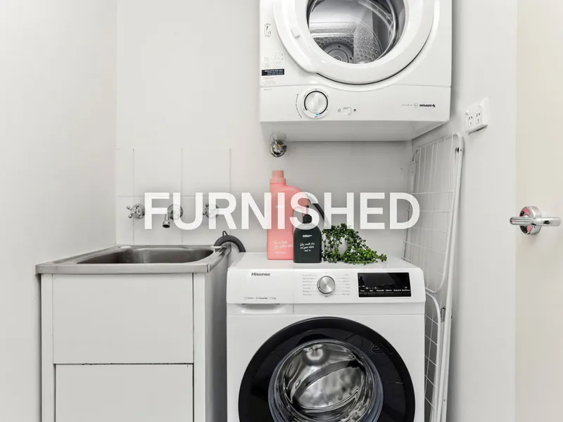 - Built-in laundry amenities include a washing machine, dryer and sink