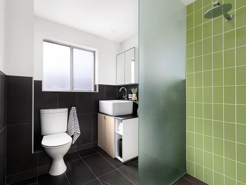 • Recently modernised bathroom tiled floor-to-ceiling in bluestone, internal laundry